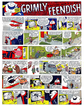 While I've got SMASH! number 3 from 1966 out, here's another Baxendale page, this time the back cover, featuring the famous Big Creep Grimly Feendish. Look at the picture of the Black Maria hurtling in, stuffed full of policemen, squishing Grimly's foot. Know what? To me, this is another of the Great Pages- and twenty one frames!! I have a large copy of it framed on my wall to remind me how it's done!